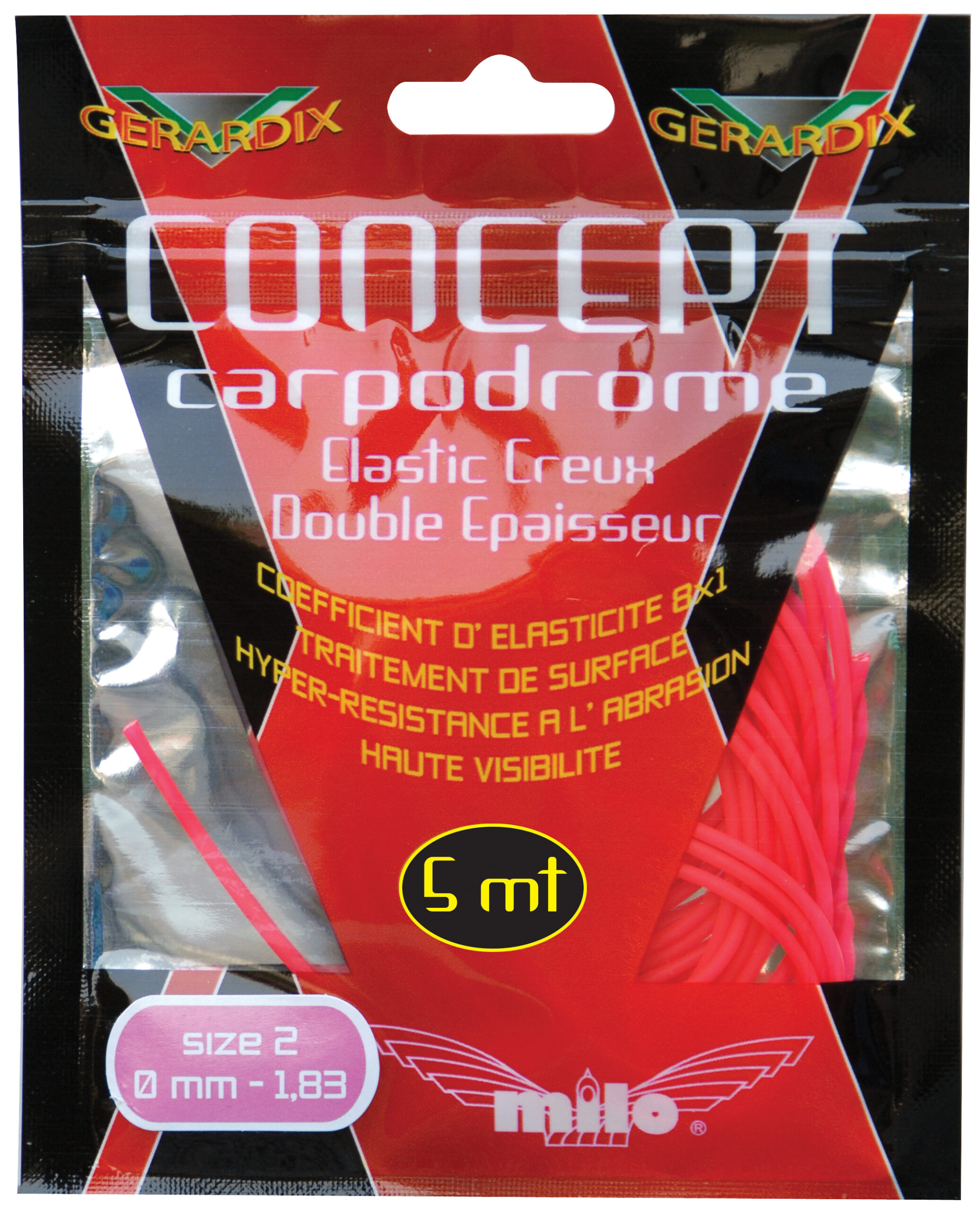 El Elastico Concept Carpodrome de Milo esta especialmente diseñado para la carpa, esta goma hueca esta revestida de silicona, de doble capa elástica hueca tiene un factor de estiramiento de 8:1 y propiedades de recuperación excelente.